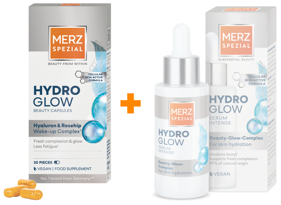 HYDRO GLOW – перфектната комбинация от капсули за красота и интензивен серум, за комплексно подхранване отвътре и интензивна грижа отвън.